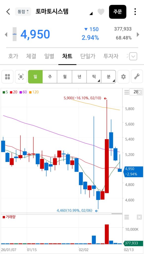 - 단기 흐름: 2월 10일에 5,900원 부근까지 치솟으며 환희를 주었으나, 며칠 새 차익 매물이 쏟아지며 4천 원대 후반으로 다시 내려왔습니다.