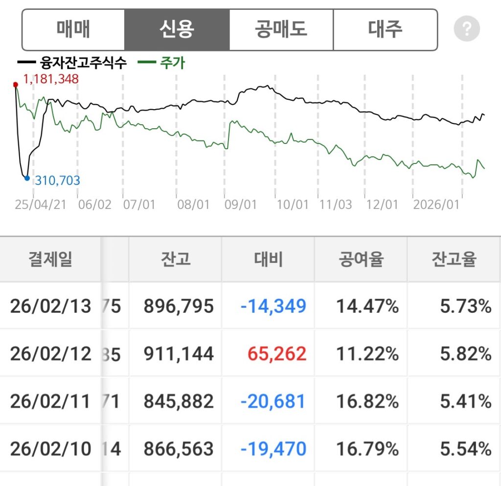 - 신용 잔고율 (5.73%): 잔고율이 5%대 후반으로 꽤 묵직한 편입니다. 빚내서 투자한 대기 물량은 단기 매물벽이 될 수 있으니, 무리하지 않고 여유를 가지며 지켜보는 것이 좋겠습니다.