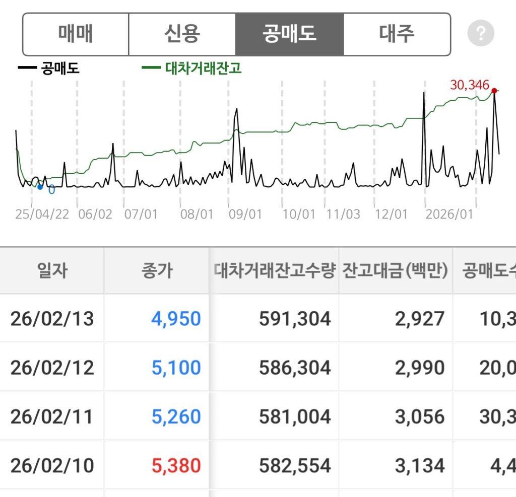 - 공매도 및 대차거래: 현재 대차거래 잔고 수량은 591,304주입니다. 공매도 세력이 여전히 위에서 짓누르고 있지만, 반대로 주가가 상승 궤도를 타면 이 물량이 숏커버링(환매수) 부스터가 되어 우리에게 날개를 달아줄 수 있습니다.