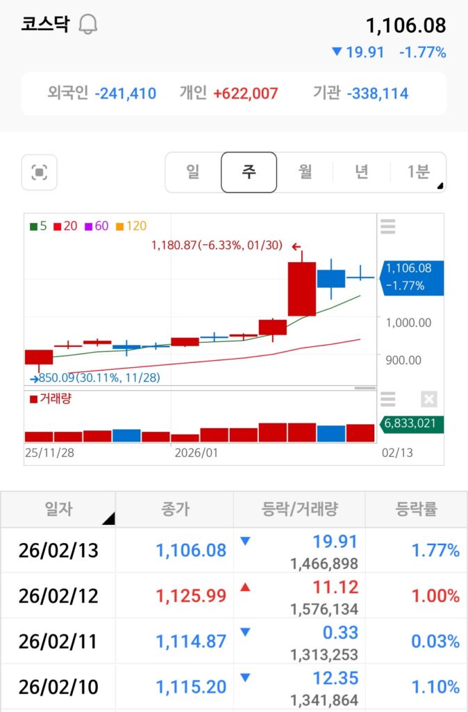 - 코스닥 지수 하락 압력 심화: 외국인과 기관의 동반 매도세로 코스닥이 1,100선 부근까지 밀리며 투심 악화 (출처: 한국거래소 시장동향 데이터)