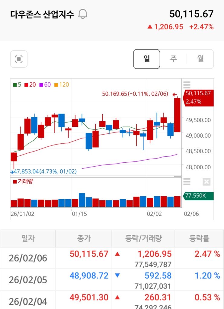 역사적인 다우 5만 시대가 열렸습니다! 어제 미국 본장의 강력한 상승 에너지가 한국 시장 개장과 동시에 우리 계좌를 보랏빛으로 물들이고 있습니다. 특히 비중이 컸던 나스닥 종목들의 회복과 함께, 그동안 저조했던 ‘서학개미’가 화려하게 반등하며 투심을 살리고 있는 기분 좋은 12일 차입니다.