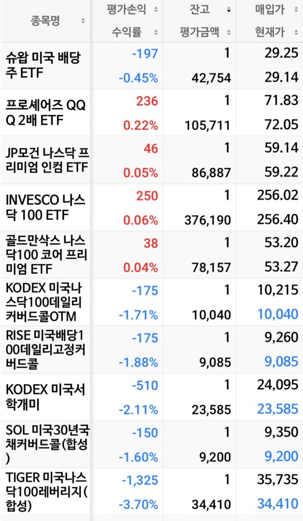 보유 종목의 최신 등락률과 수익률입니다. 한국 상장 ETF들은 미국 본장의 변동성을 즉각 반영하여 정직한 숫자를 보여주고 있습니다. 📈