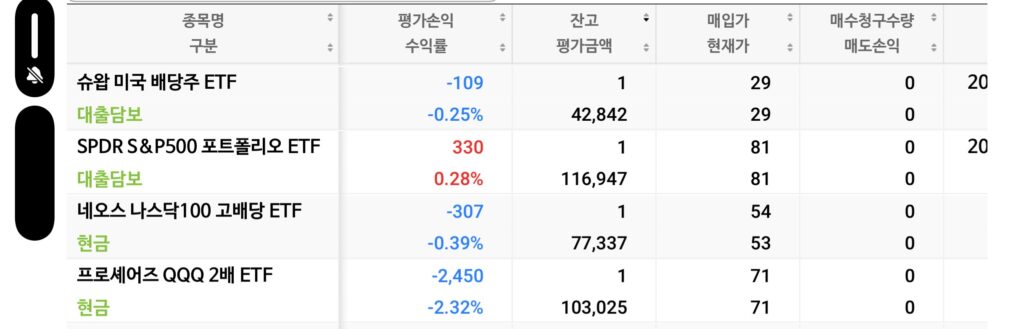 | 티커 | ETF 명칭 | 유형 | 당일 등락 | 평가 수익률 | 상태 |